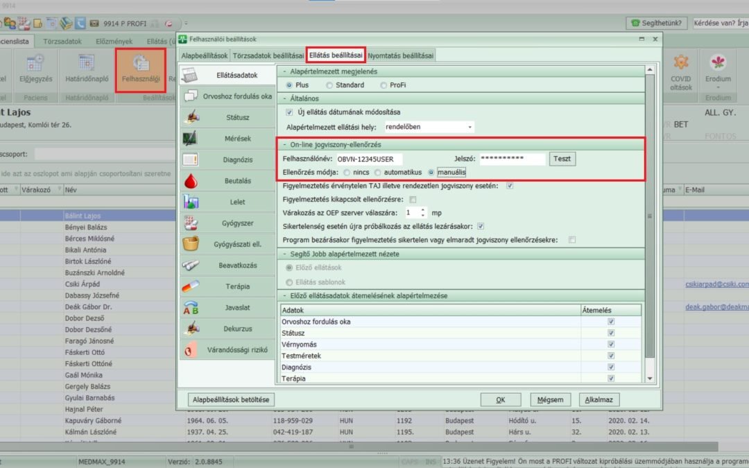 Munkatársaink segítenek beállítani az online TAJ ellenőrzést a MedMax magánorvosi programban. A beállítást követően érvénytelen jogviszony esetén a MedMax figyelmeztet, valamint automatikusan Teljes árral fogja felajánlani a jogcímet gyógyszerfelíráskor.