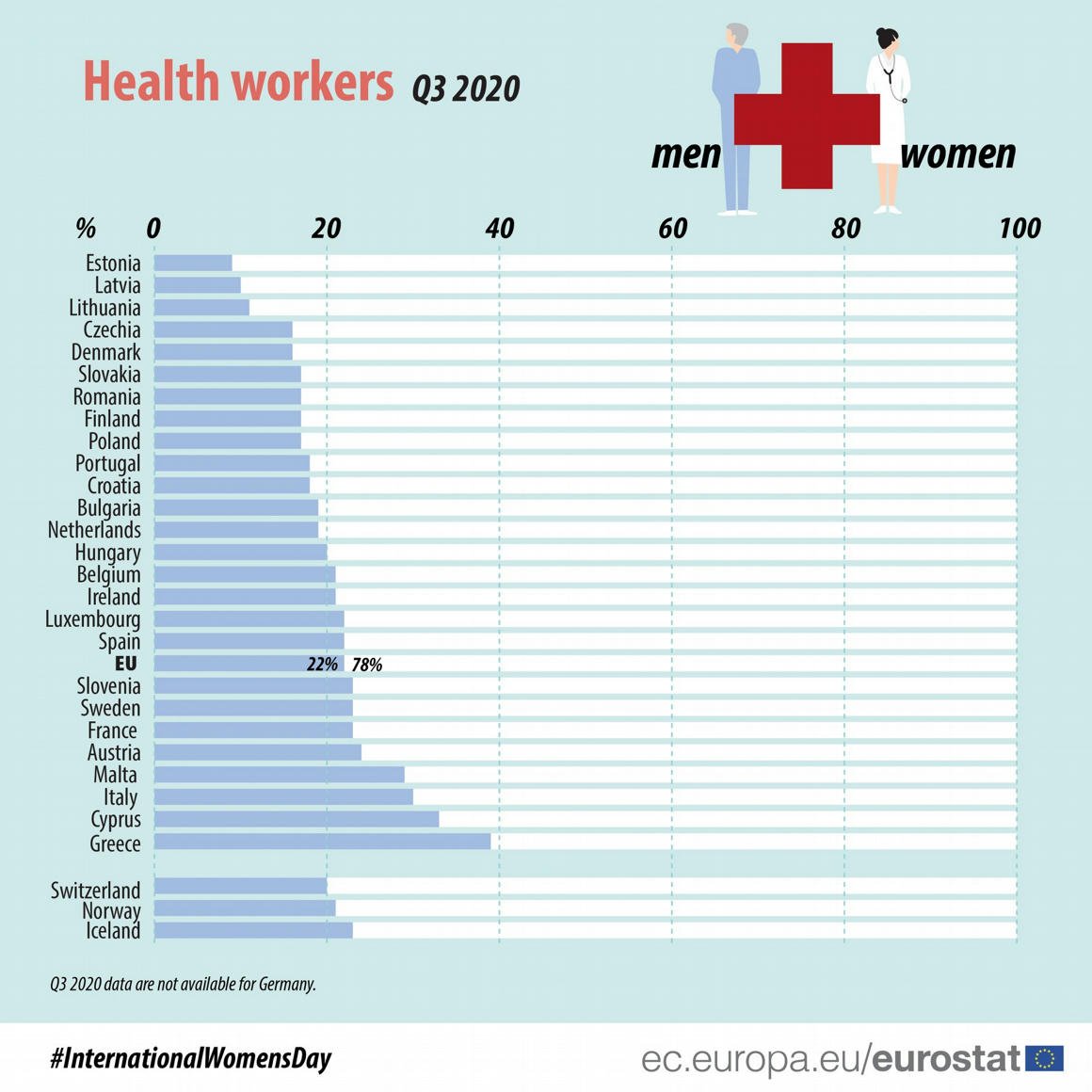 Az egészségügyi dolgozók körében EU-szerte felülreprezentáltak a nők. Magyarországon az egészségügyi dolgozók 80 százaléka nő, az uniós átlag 78 százalék.