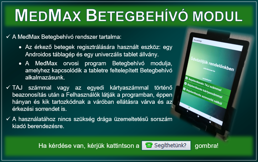 • a MedMax Betegbehívó modulhoz kérhető a MedMax on-line Előjegyzés – okostelefonra fejlesztett – modulja 1 év díjmentes használattal.