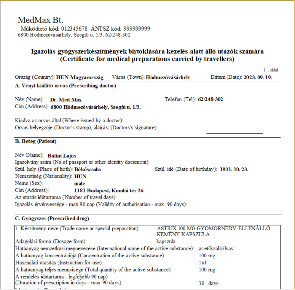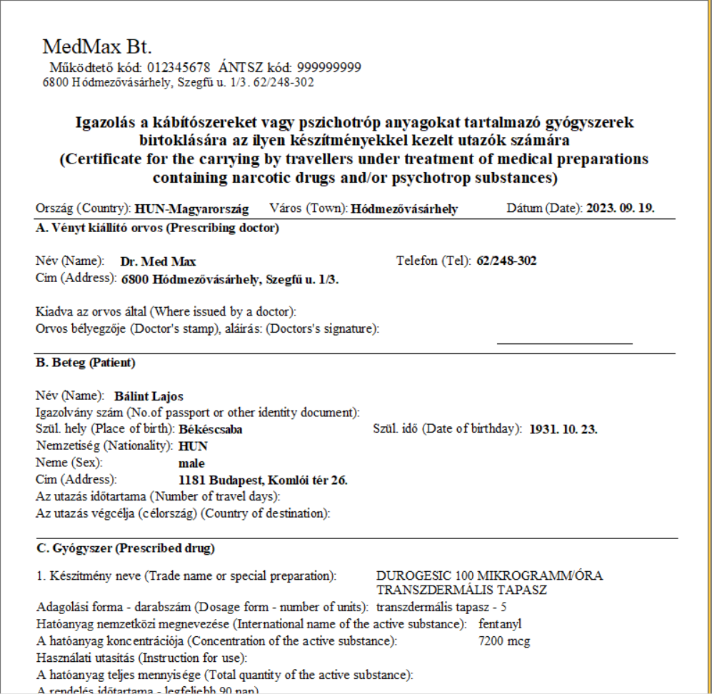 A MedMax az Utazási gyógyszerigazolást az OGYEI oldalán közzétett formanyomtatvány alapján, az Utazási kábítószer-igazolást pedig a 43/2005. (X. 15.) EüM rendelet melléklete alapján készíti el.